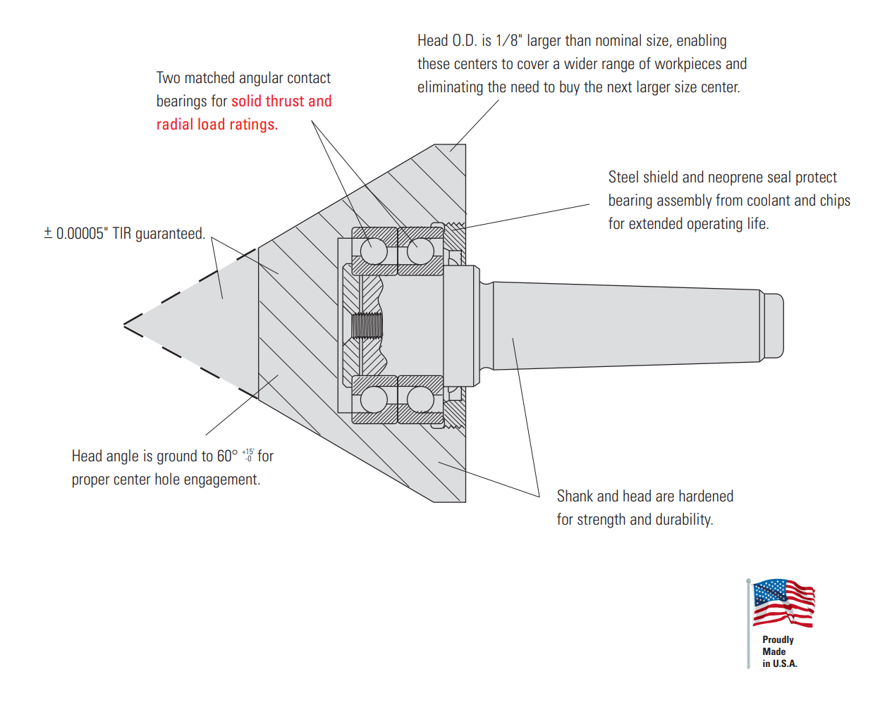 - Head diameter is 1⁄8" over nominal size, enabling these centers to cover a wider range of workpieces.