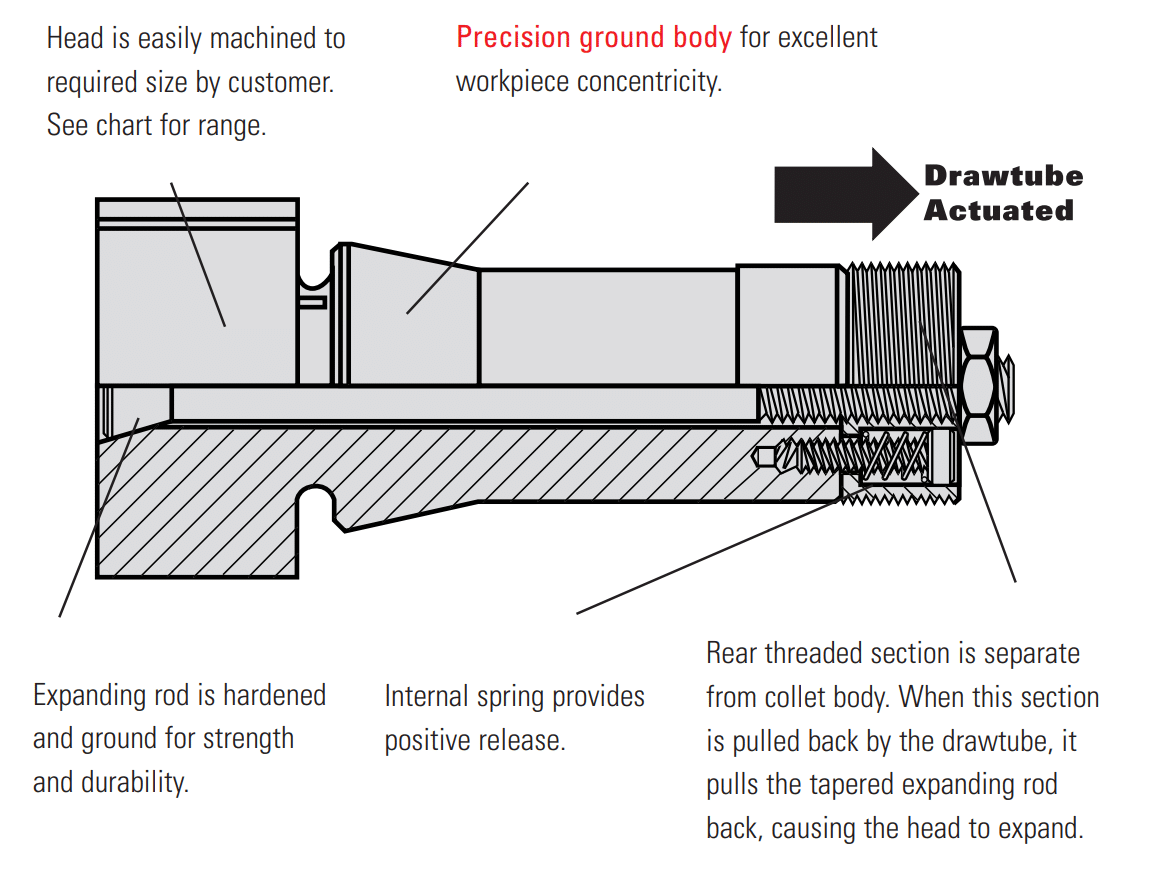 - Collet head is easily machined to required size. Can be re-machined as necessary.
