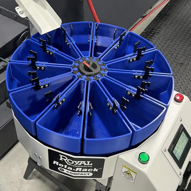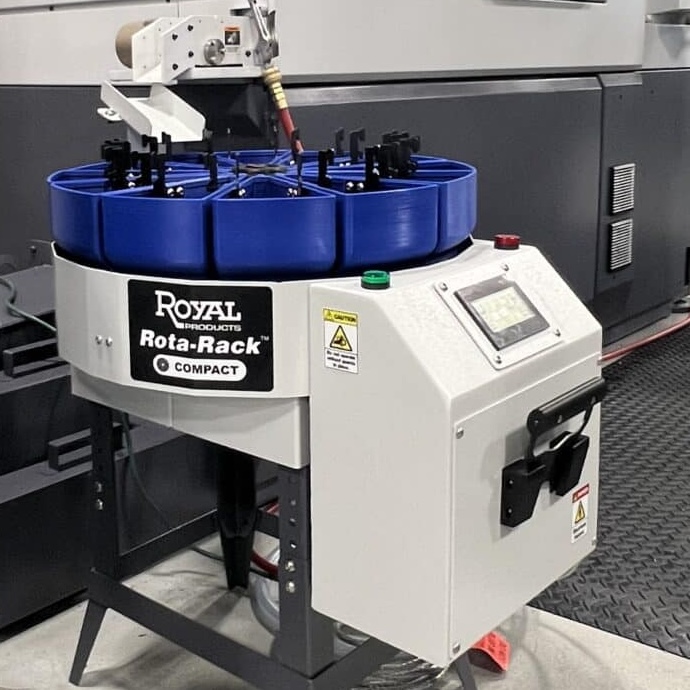 The Royal Rota-Rack® Compact delivers hours of unmanned production, batches parts for easy inspection, and protects finished components from damage. Specifically designed for small parts!